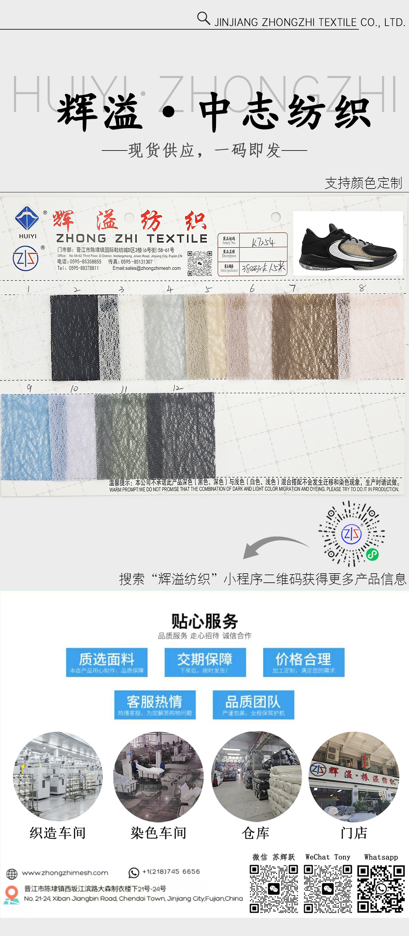 Fundada en 2008, Jinjiang Zhongzhi Textile Co., Ltd. es un fabricante líder de alto rendimiento Telas de malla para calzado deportivo , incluyendo Malla Sandwich, Malla de Capa Única, Malla Jacquard, Tejido de Malla 3D y así sucesivamente . A través de la inversión continua en tecnología avanzada y un enfoque en Innovación , la empresa ha crecido desde un proveedor local hasta convertirse en un socio de confianza para Marcas globales .