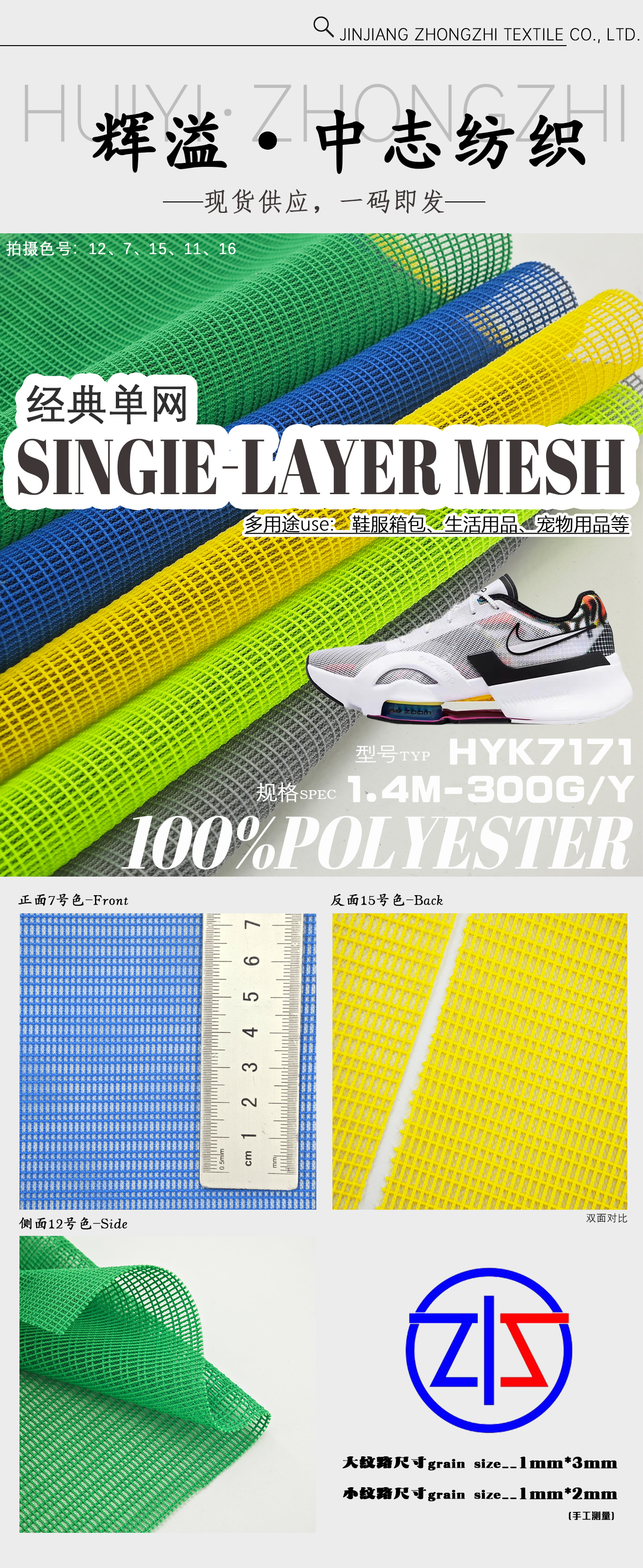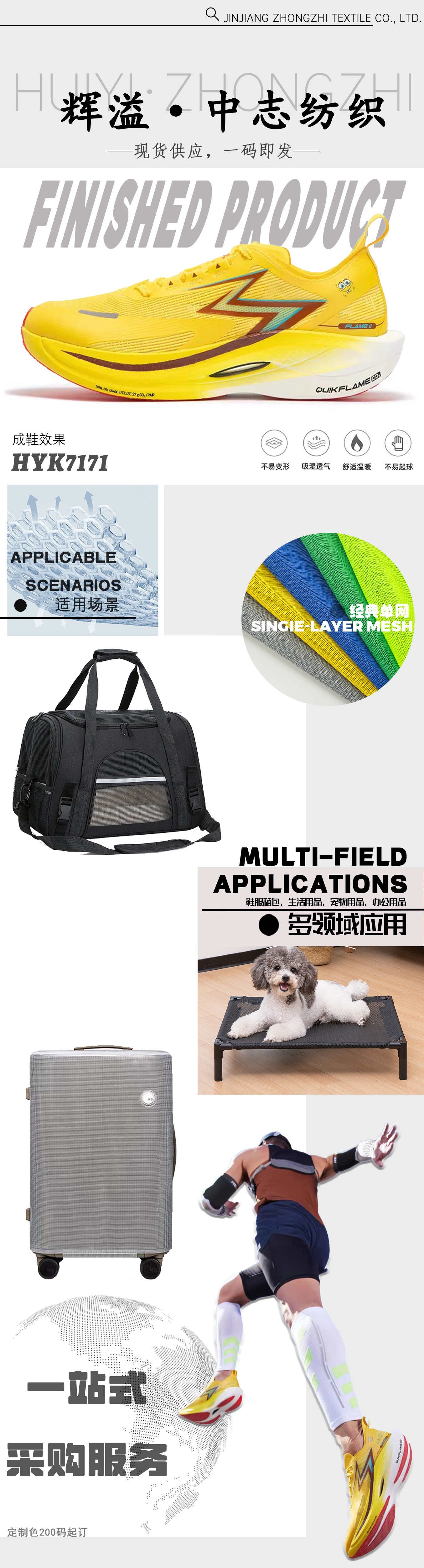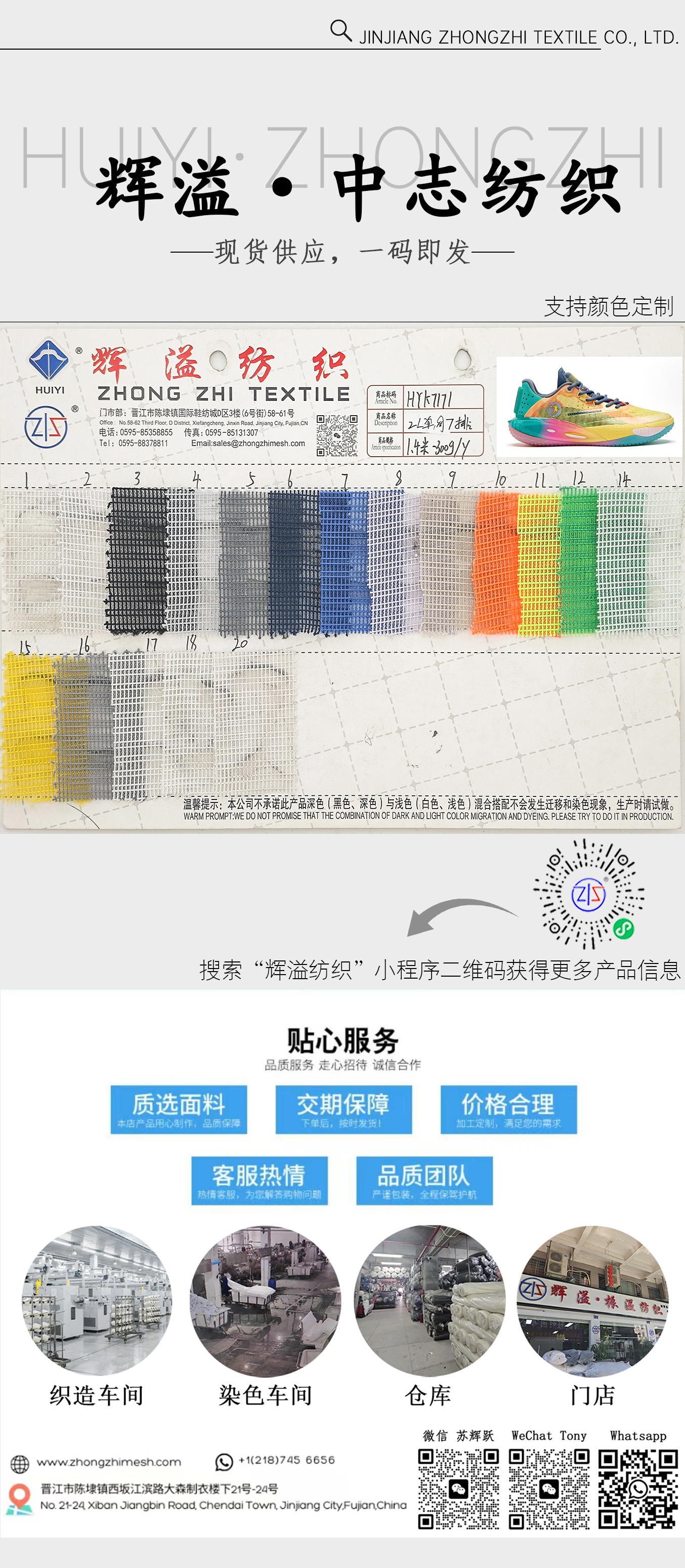 Fundada en 2008, Jinjiang Zhongzhi Textile Co., Ltd. es un fabricante líder de alto desempeño Telas de malla para calzado deportivo , incluyendo Malla Sandwich, Malla de Capa Única, Malla Jacquard, Tela de Malla 3D y así sucesivamente . A través de la inversión continua en tecnología avanzada y un enfoque en Innovación , la empresa ha crecido desde un proveedor local hasta convertirse en un socio de confianza para Marcas globales .