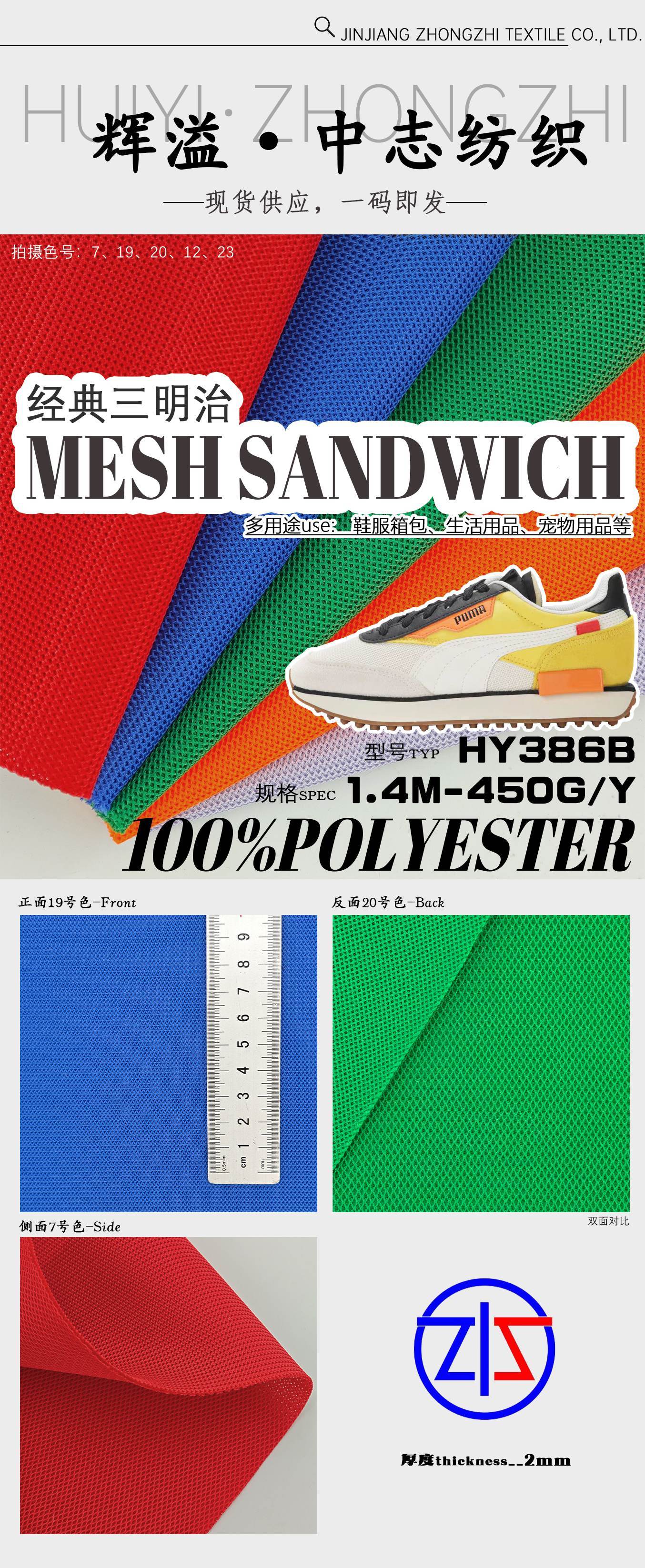 HY386B-386 Tejido de malla sándwich 100% poliéster clásico para zapatillas deportivas: duradero, transpirable y ligero