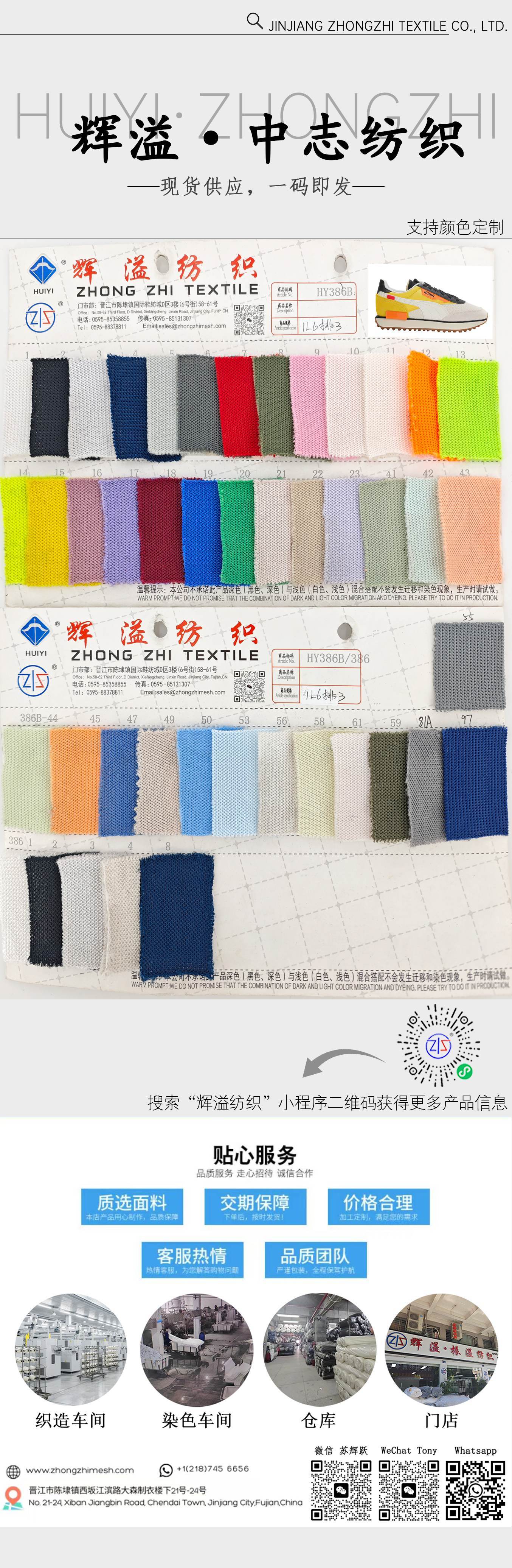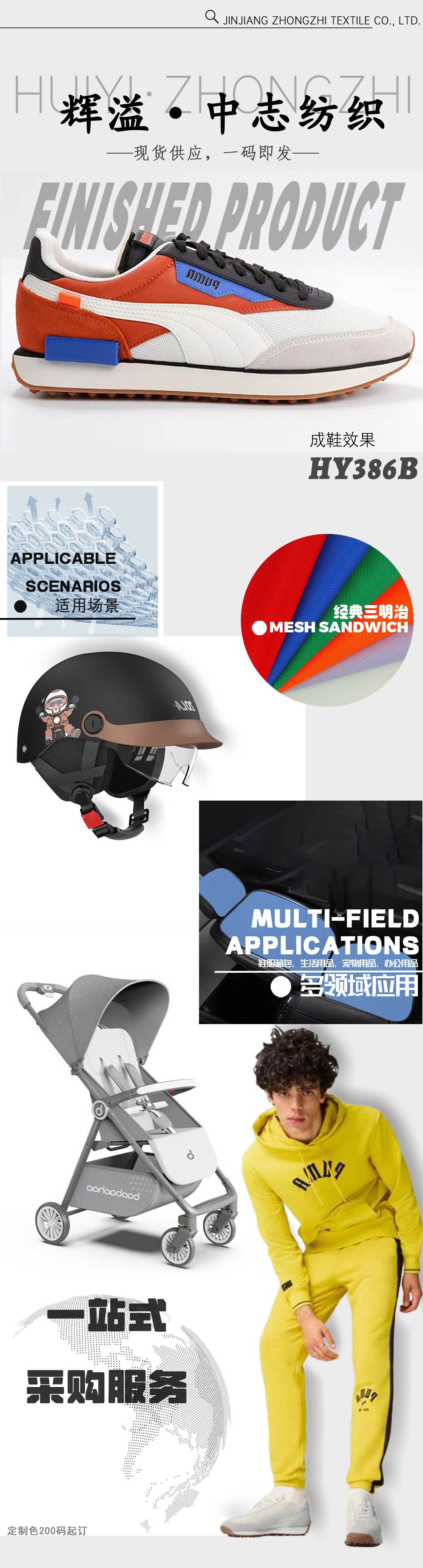 - Nombre del producto: HY386B-386 Tejido de malla sándwich 100% poliéster clásico para zapatillas deportivas: duradero, transpirable y ligero
