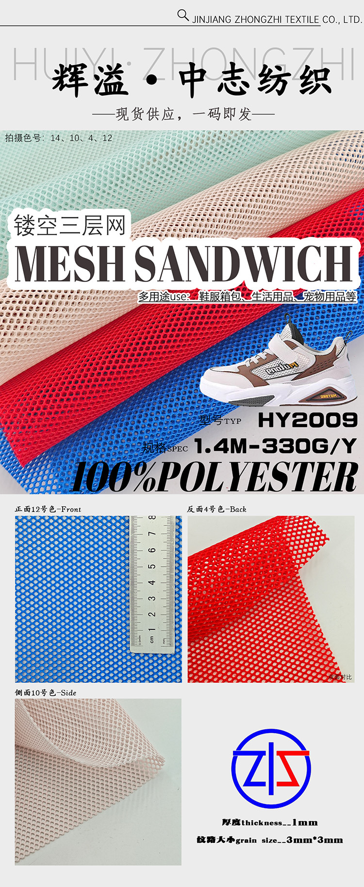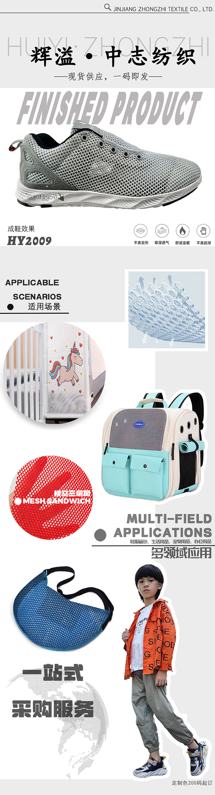 - Nombre del producto: Tela de malla tipo sándwich 100% poliéster clásica HY2009 para zapatillas deportivas: duradera, transpirable y ligera