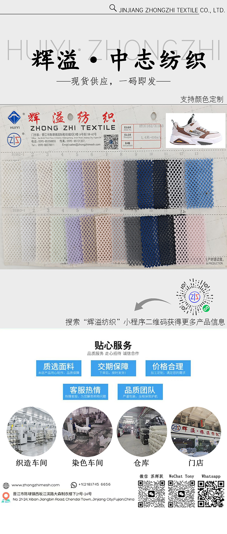 Fundada en 2008, Jinjiang Zhongzhi Textil Co., Ltd. es un fabricante líder de alto rendimiento Telas de malla para calzado deportivo , incluyendo Malla Sandwich, Malla de Capa Única, Malla Jacquard, Tejido de Malla 3D y así sucesivamente . A través de inversiones continuas en tecnología avanzada y un enfoque en Innovación , la compañía ha crecido desde un proveedor local hasta convertirse en un socio de confianza para Marcas globales .