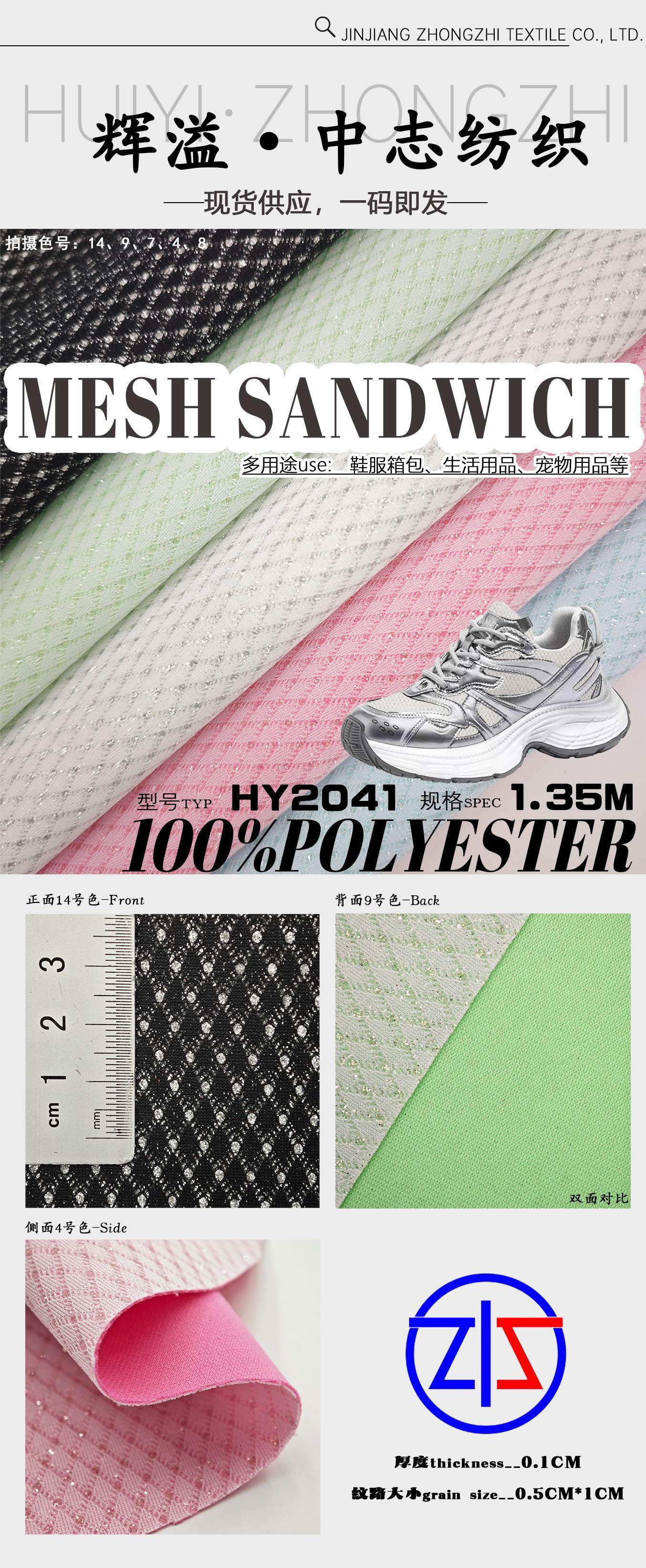 - Nombre del producto: HY2041 Malla tipo sándwich de 100% poliéster clásica para zapatillas deportivas: duradera, transpirable y ligera