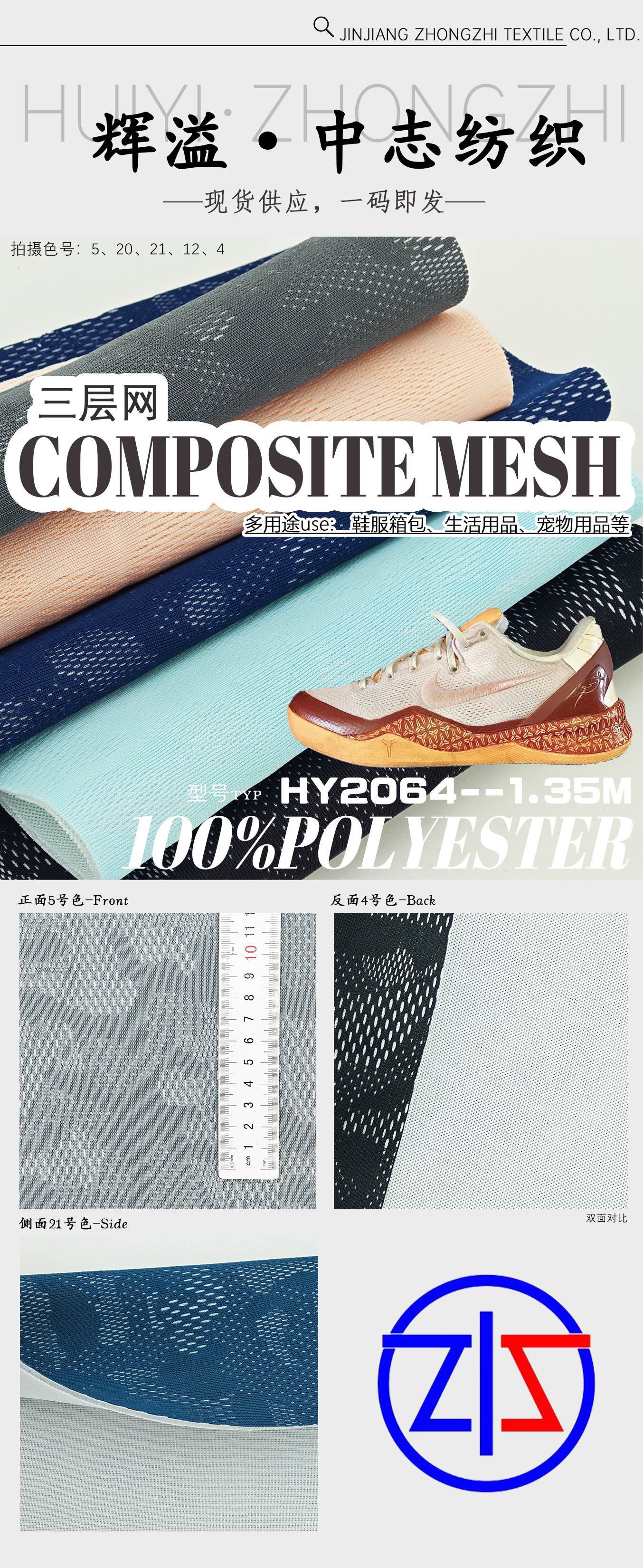- Nombre del producto: HY2064 Tela de malla sándwich laminada 100% poliéster para zapatillas deportivas - Duradera, transpirable, ligera