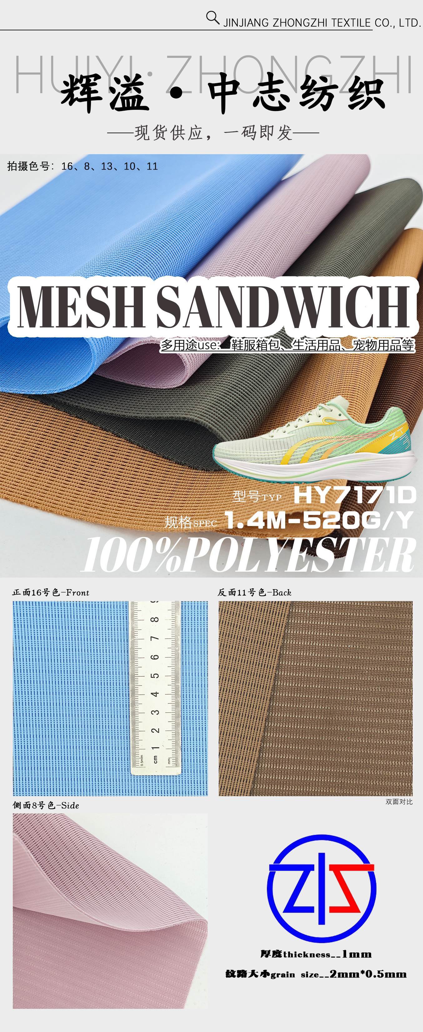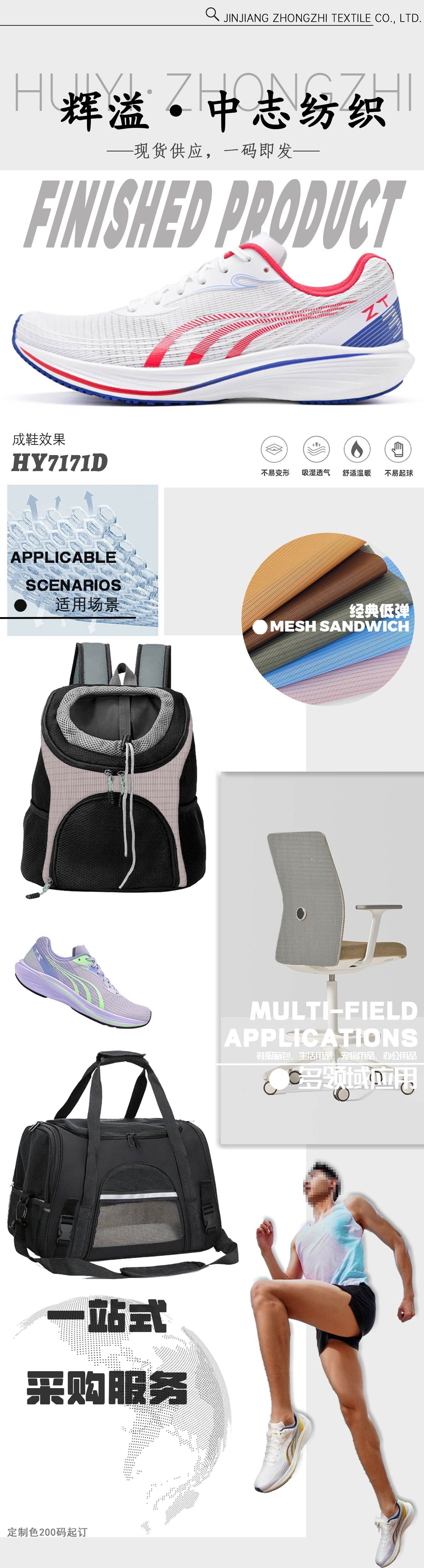 - Nombre del producto: HY7171D Tejido de malla sándwich 100% poliéster clásico para zapatillas deportivas: duradero, transpirable, ligero