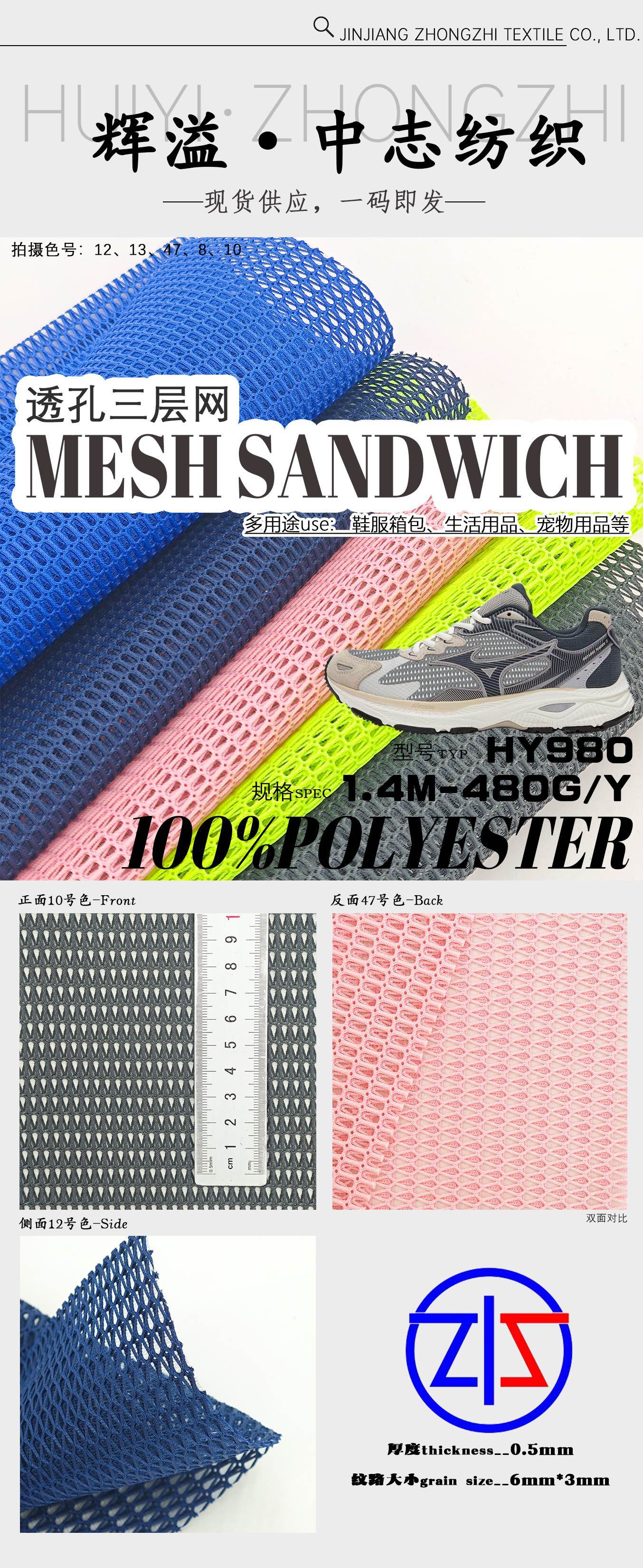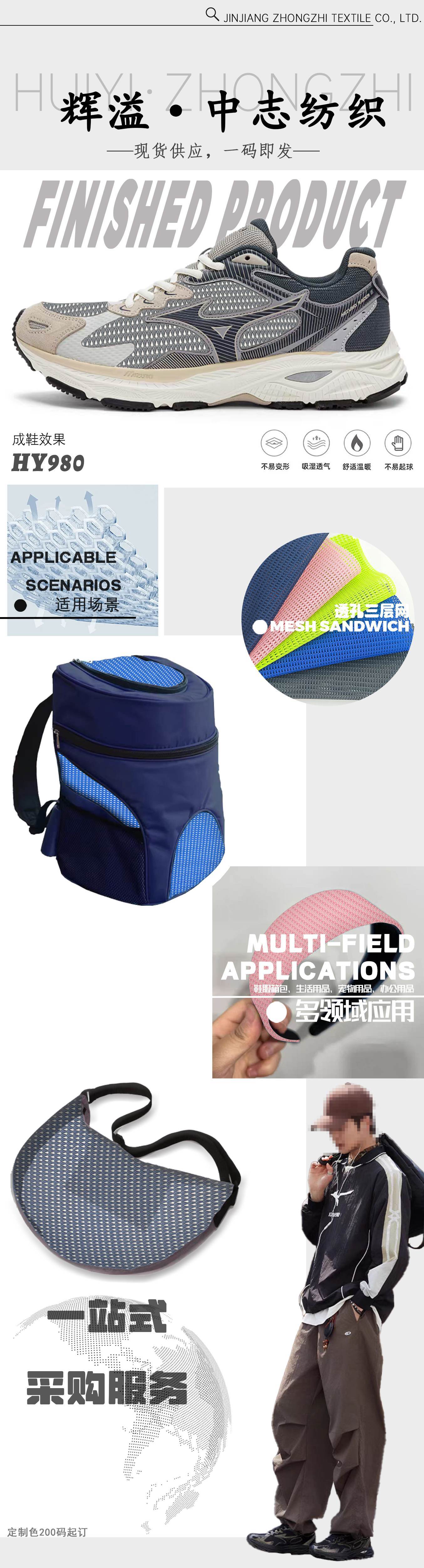 - Nombre del producto: HY980 Malla tipo sándwich de 100% poliéster clásica para zapatillas deportivas: duradera, transpirable y ligera